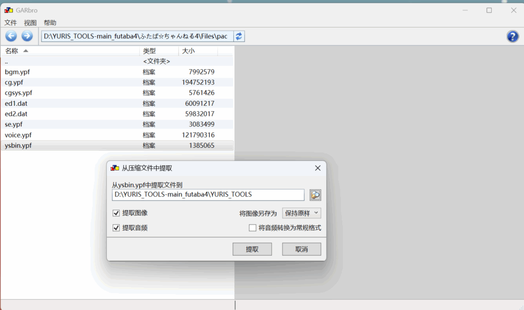 找到游戏的 ysbin.ypf 文件,并使用 GARbro 解压至 YURIS-TOOLS 文件夹中: