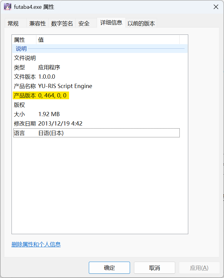找到游戏启动的 .exe 文件并查看属性中的产品版本,确认 YU-RIS 引擎版本号: