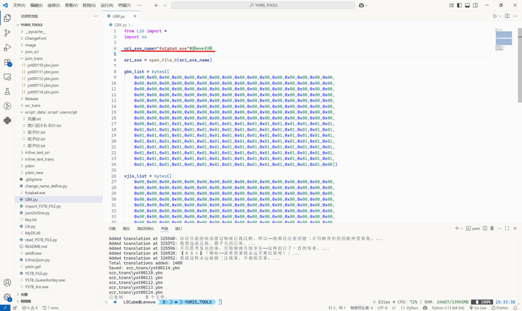 将游戏 .exe 文件复制到 YURIS-TOOLS 目录下,编辑 GBK.py 文件中的 Line 4,将其更改为 .exe 名称: