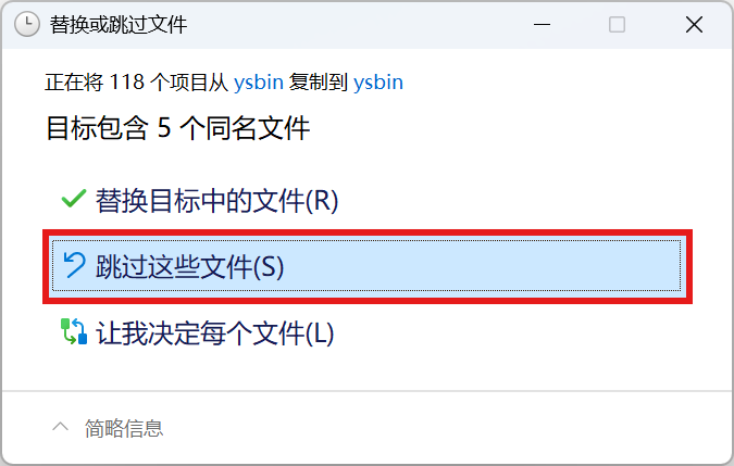 保存后将 ysbin 文件夹中所有文件复制到 Release/ysbin 中,并跳过同名文件: