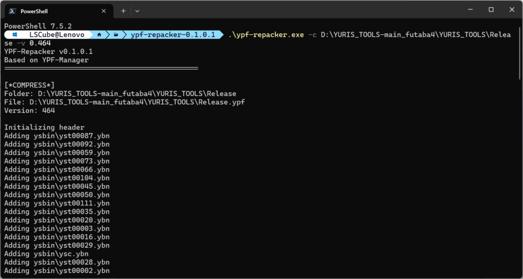 使用 ypf-repacker.exe 执行命令,得到 Release.ypf 文件,并将其重命名为 ysbin.ypf,替换游戏目录的 ysbin.ypf 文件: